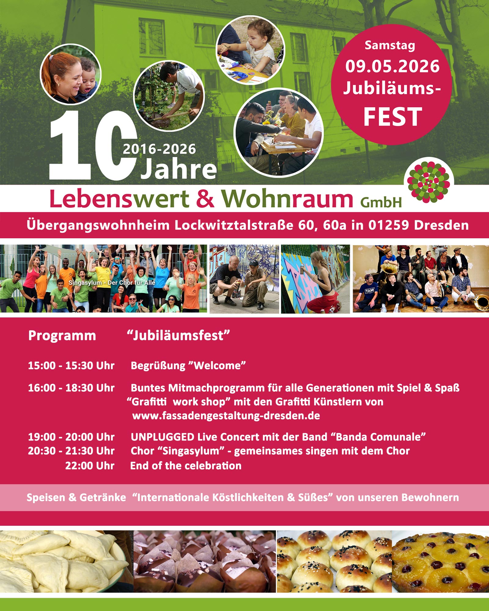 Wie die Zeit schnell vergeht! Kaum zu glauben, dass Übergangswohnheim für Flüchtlinge und Asylbewerber in der Lockwitztalstraße in Dresden wurde vor 10 Jahren eröffnet. Wir von Lebenswert & Wohnraum GmbH als Betreiber von dem Übergangswohnheim und unser Team wünschen uns natürlich noch weitere 10 Jahre im Übergangswohnheim. Diese 10-jährige erfolgreiche Arbeit in der Integrationsarbeit haben wir dem super, engagierten Team vor Ort und vielen externen Beteiligten aus sozialen, kulturellen Institutionen zu verdanken!